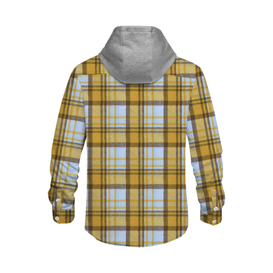 Yellow Plaid Long Sleeve Hooded Shirt For Men