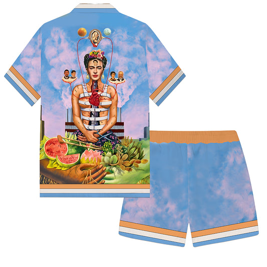 Mexican Painter Frida Personality Character Pattern Camp Collar Casual Shirt in Blue