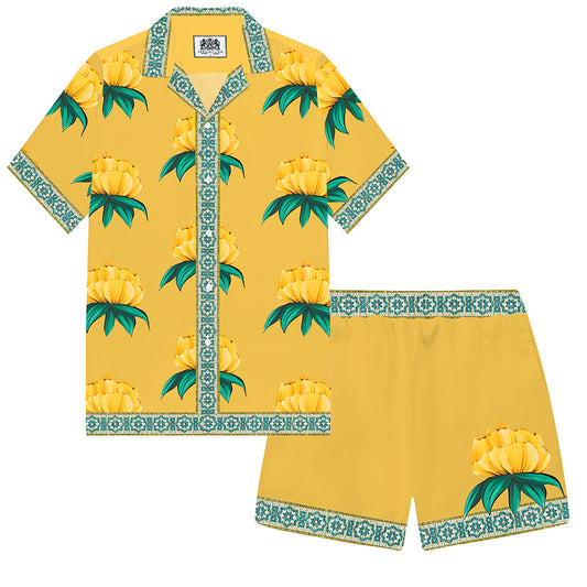 Summer Floral Print Camp Collar Casual Shirt Men's Yellow Short-Sleeved Shirt