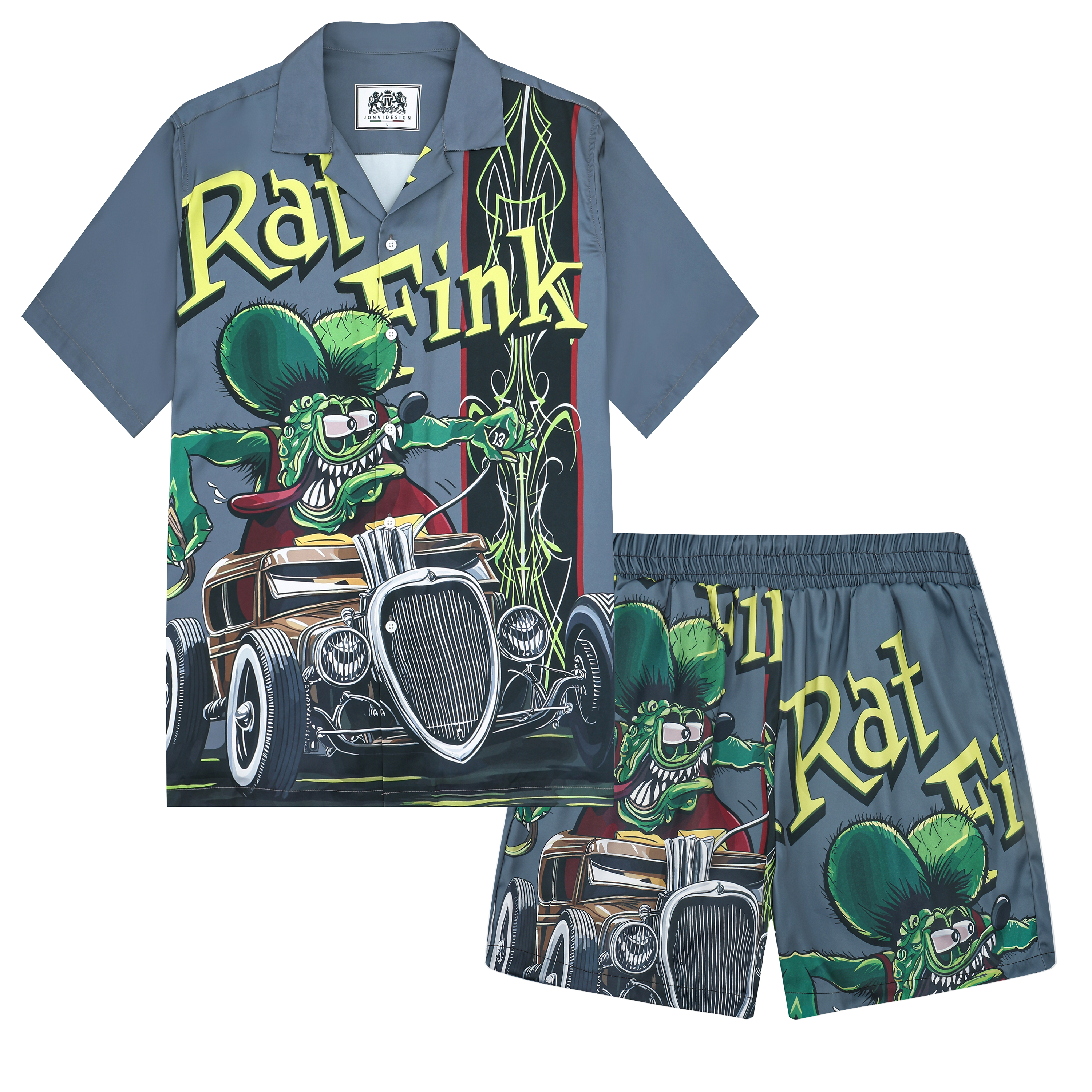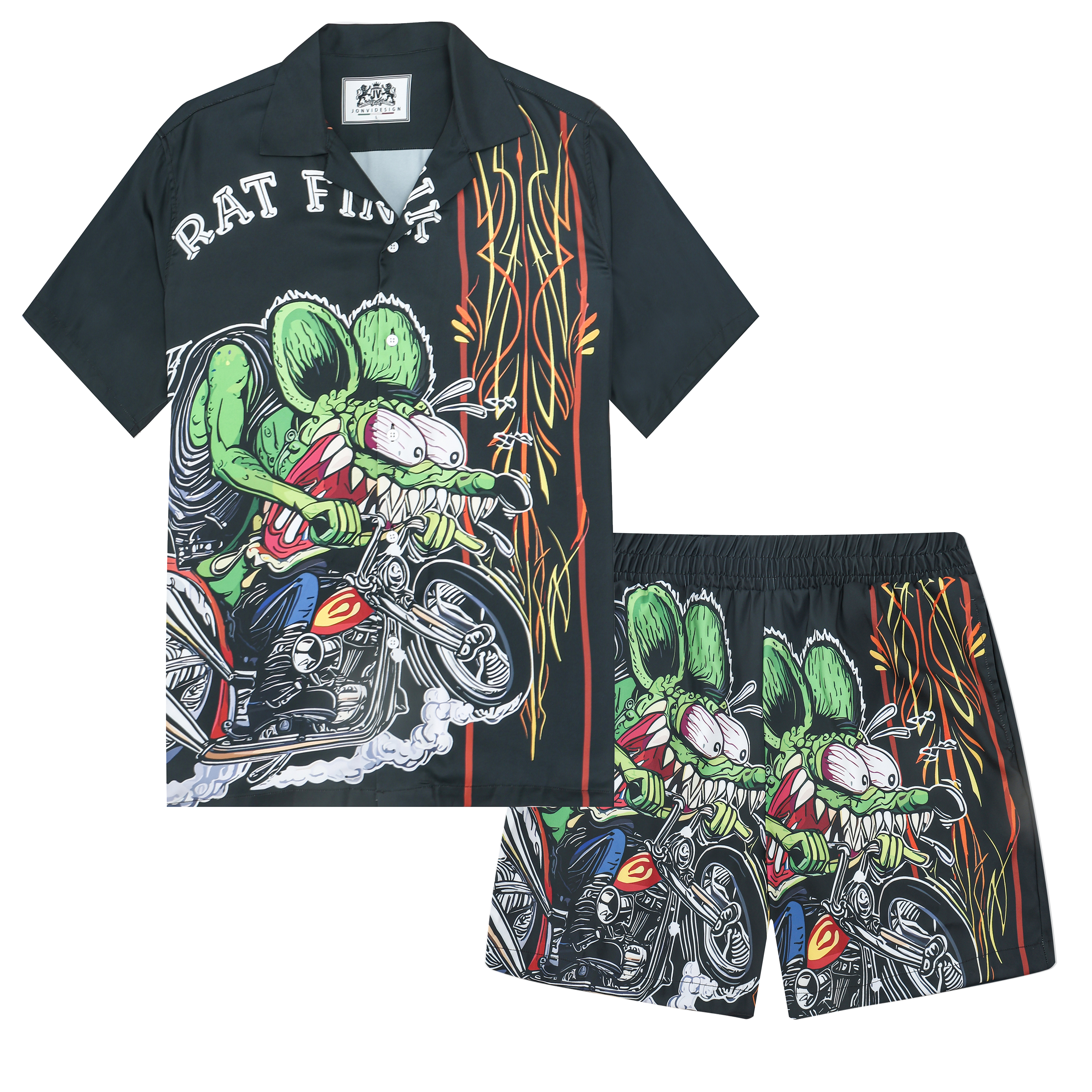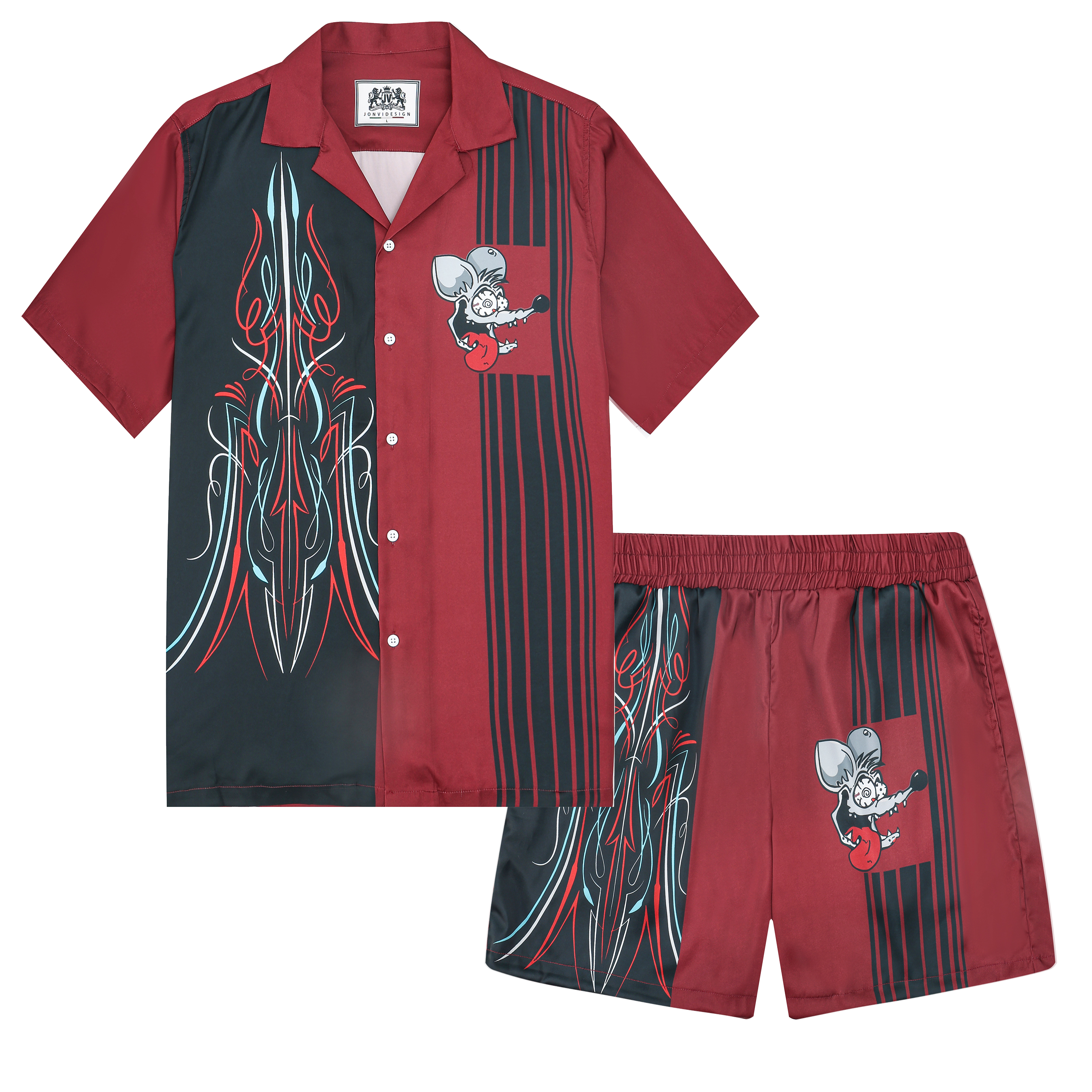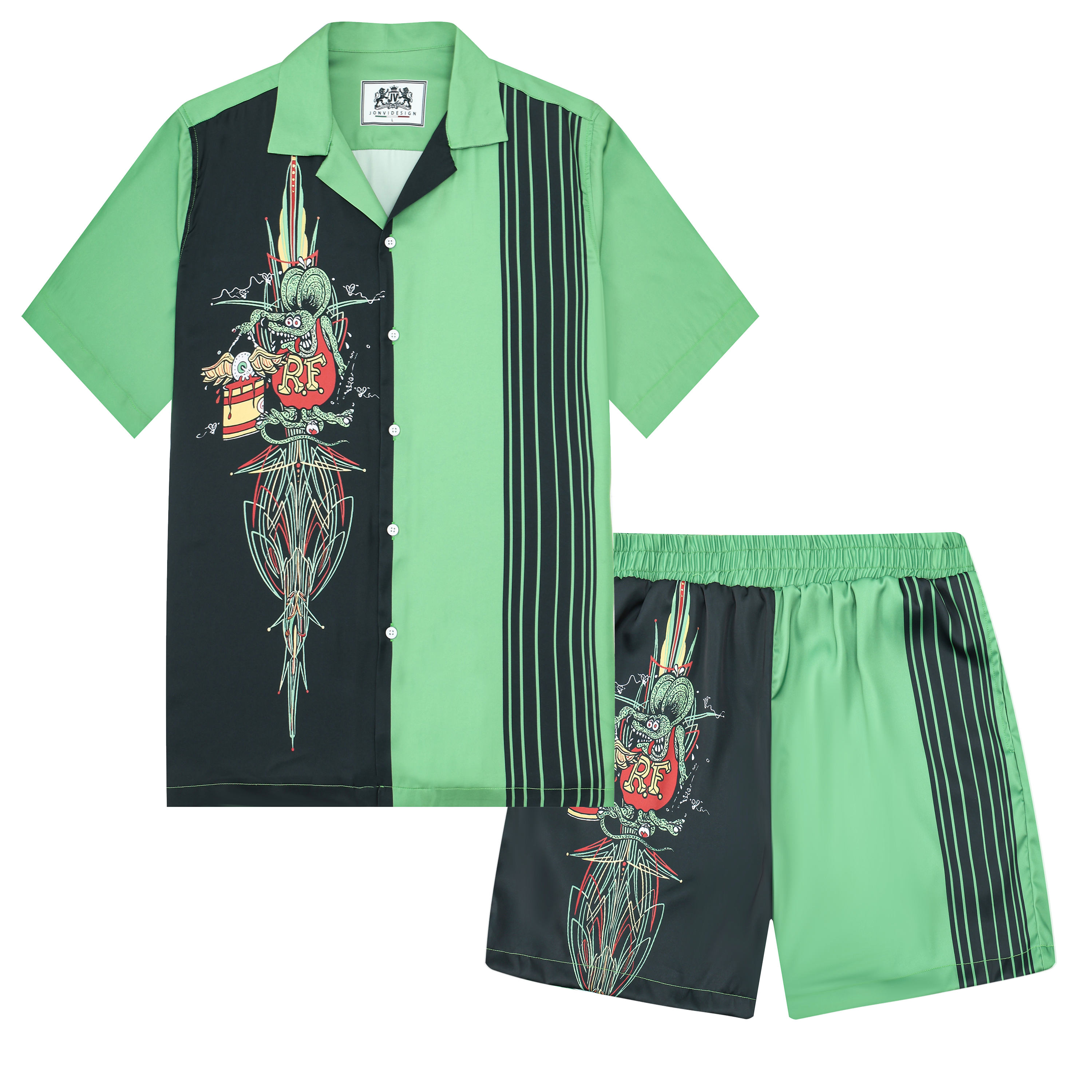 Black And Green Color Block Mouse Print Camp Collar Short Sleeve Shirt For Men$43.99 USD$69.00 USD