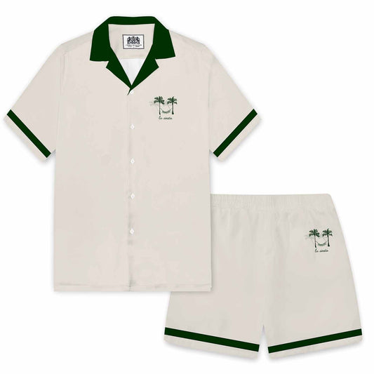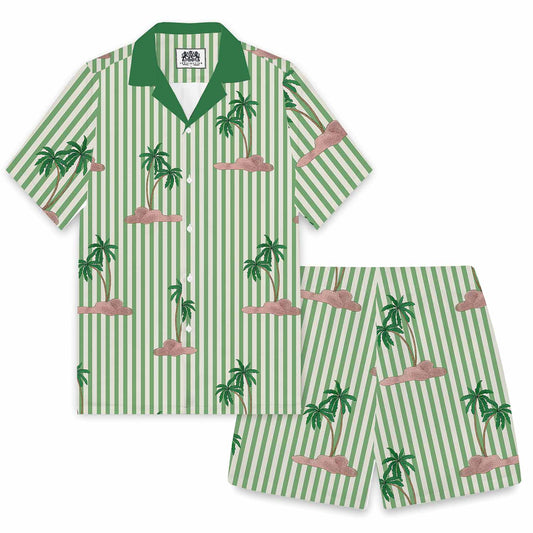 Green Striped Coconut Tree Pattern Camp Collar Short-Sleeved Shirt
