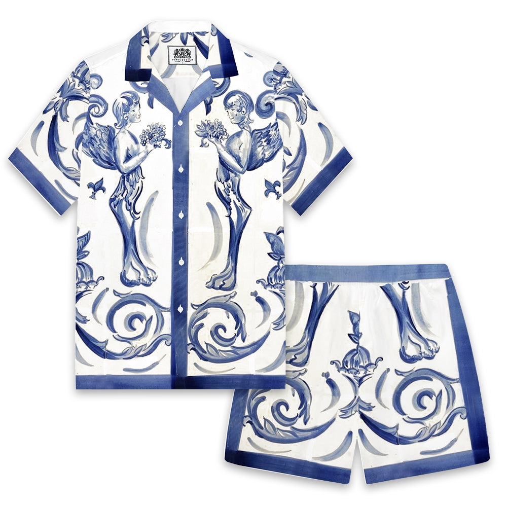 Little Angel Blue and White Porcelain Print Pattern Camp Collar Short Sleeve Shirt$43.99 USD$69.00 USD