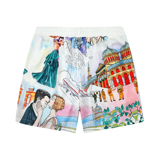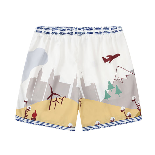Multicolor Castle Pattern Silk Fiber Waistband Shorts