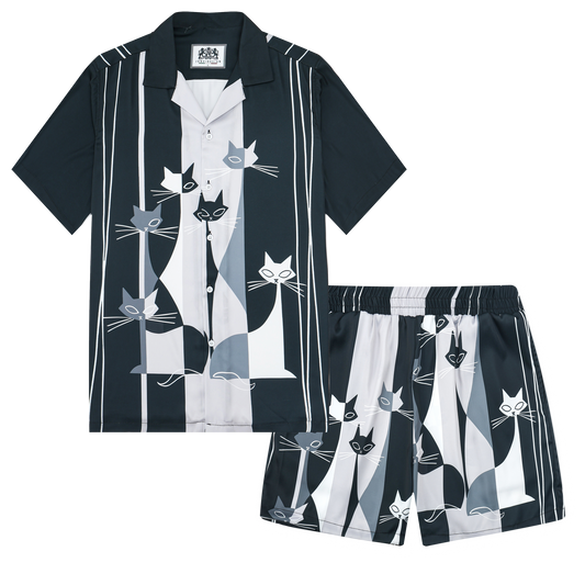 Six Cat Print Camp Collar Short Sleeve Shirt