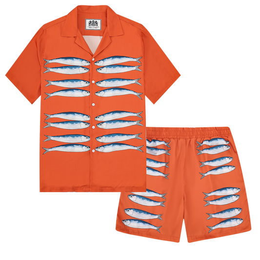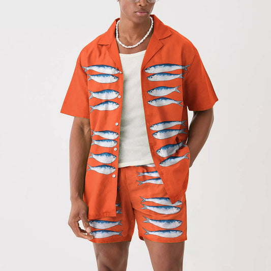 Sardine Pattern Orange Camp Collar Short Sleeve Shirt