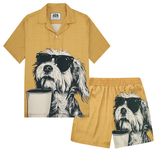 Puppy Drinking Coffee Print Camp Collar Short Sleeve Shirt
