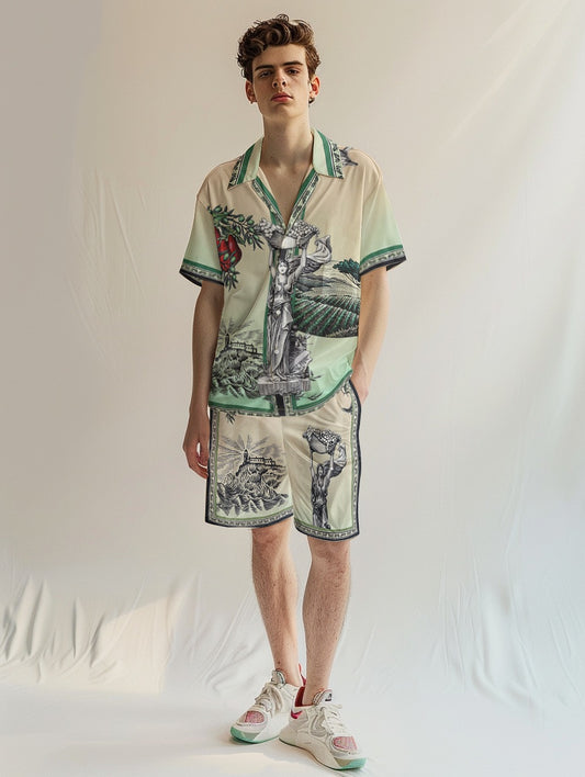 Greek Statue Olive Branch Short Sleeve Camp Collar Shirt