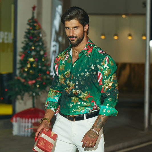 Green Floral Pattern Camp Collar Long Sleeve Shirt