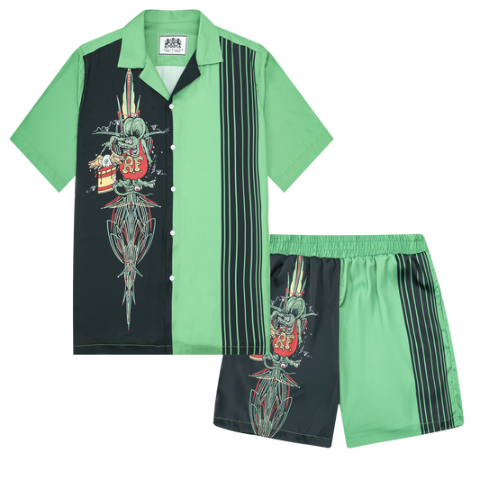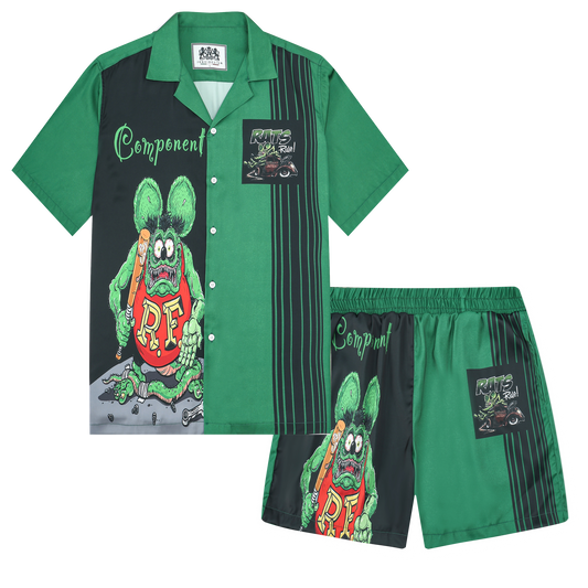 Black And Green Color Block Mouse Print Camp Collar Short Sleeve Shirt For Men