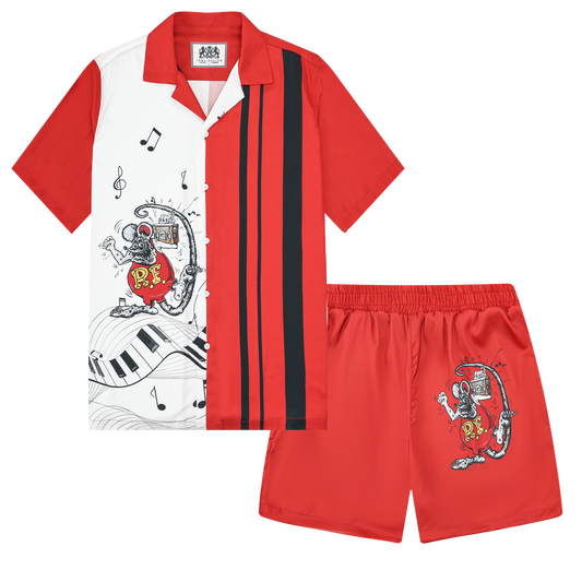 Black And Red Mouse Print Camp Collar Short Sleeve Shirt For Men