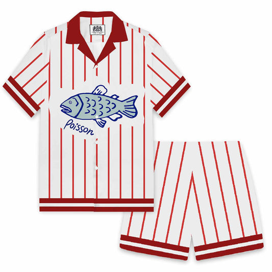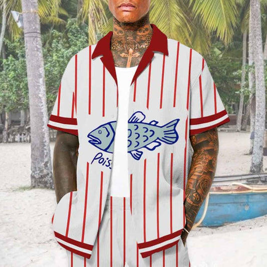 Vertical Striped Fish Pattern Camp Collar Short Sleeve Shirt