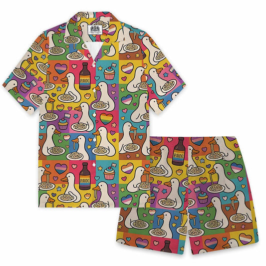 Funny Goose Eating Spaghetti Print Camp Collar Short-Sleeved Shirt