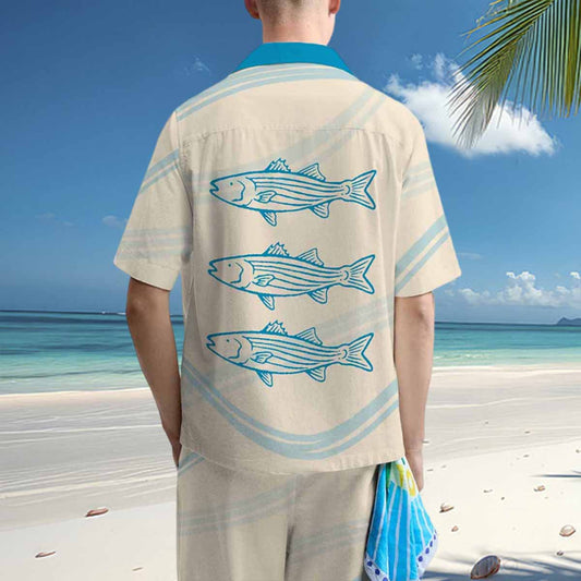 Striped Fish Print Blue Camp Collar Casual Short Sleeve Shirt