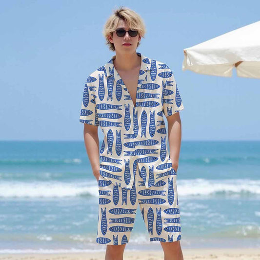 Summer Hawaiian Blue Fish Pattern Camp Collar Short Sleeve Shirt