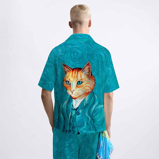 Cat Van Gogh Portrait Print Camp Collar Short-Sleeved Shirt