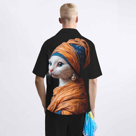 Funny Cat Girl With Pearl Earring Print Camp Collar Short-Sleeved Shirt