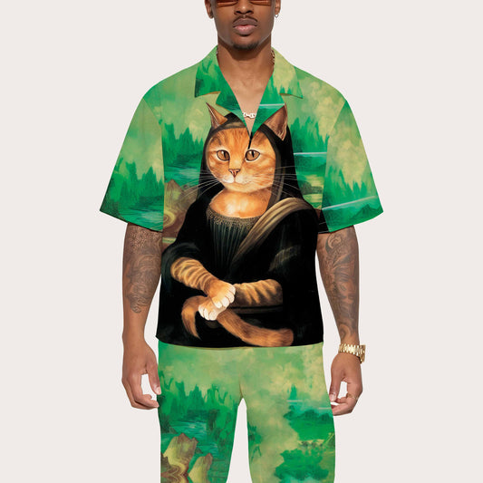 Funny Cat Art Lovers Print Camp Collar Short-Sleeved Shirt