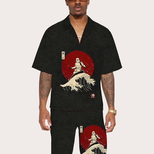 Japanese Style The Great Wave 0ff Kanagawa Print Camp Collar Short-Sleeved Shirt