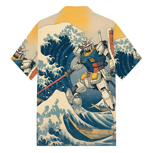 Ukiyoe The Great Wave off Kanagawa Gundam Fighter Print Camp Collar Short Sleeve Shirt