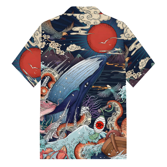 Japanese Whale Sun Wave Trippy Animal Print Camp Collar Short Sleeve Shirt