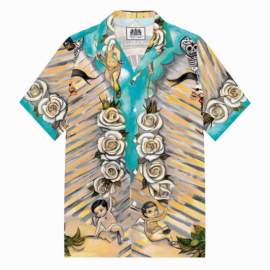 Horseback Riding Flower Print Camp Collar Short Sleeve Shirt
