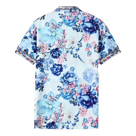 Floral Pattern Short Sleeve Camp Collar Shirt in Blue