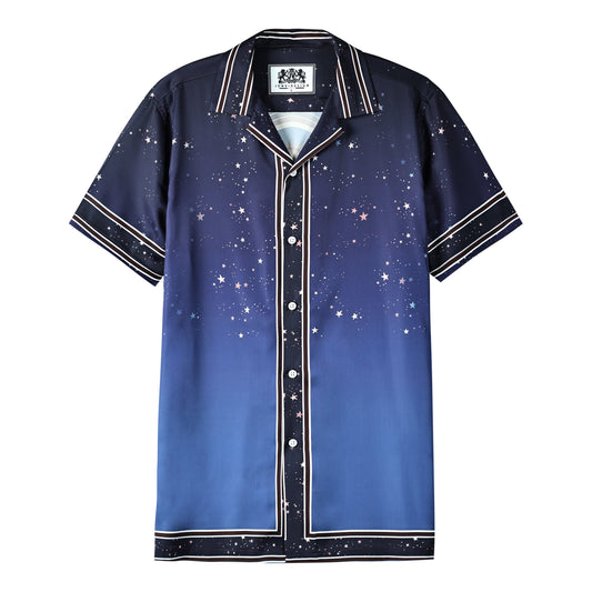 Statue Starry Night Palm Tree Short Sleeve Camp Collar Shirt
