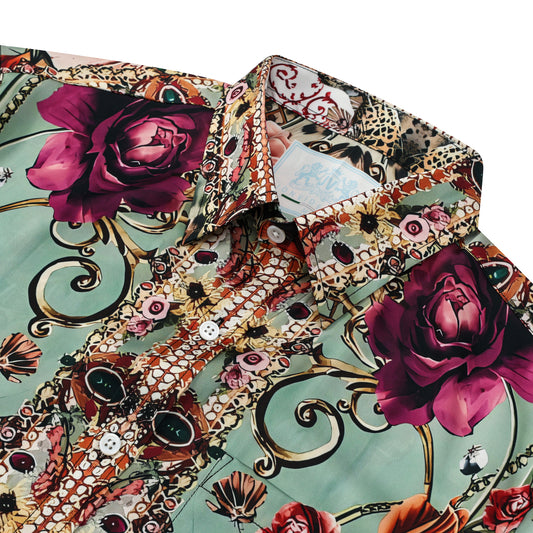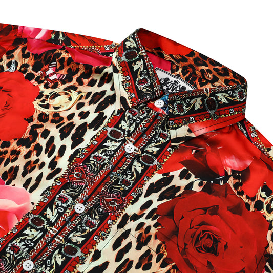 Red Rose Leopard Printed Silk Fiber Short Sleeve Shirt