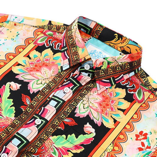 Dragon Floral Pattern Button Short Sleeve Shirt