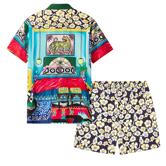 Multicolor Castle Pattern Silk Fiber Waistband Shorts