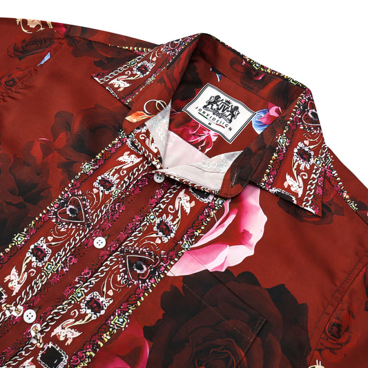 Red Rose Floral Silk Fiber Short Sleeve Casual Shirt