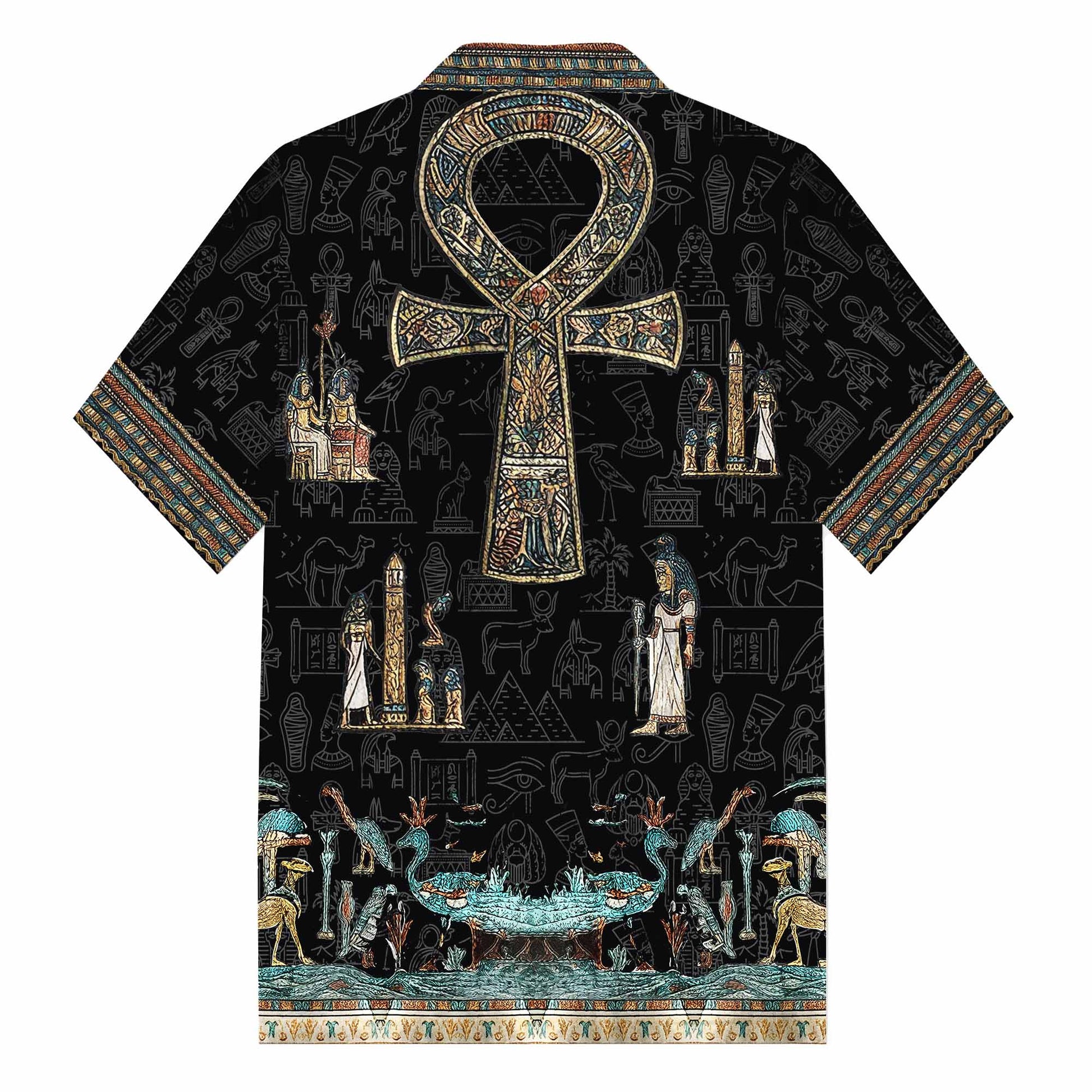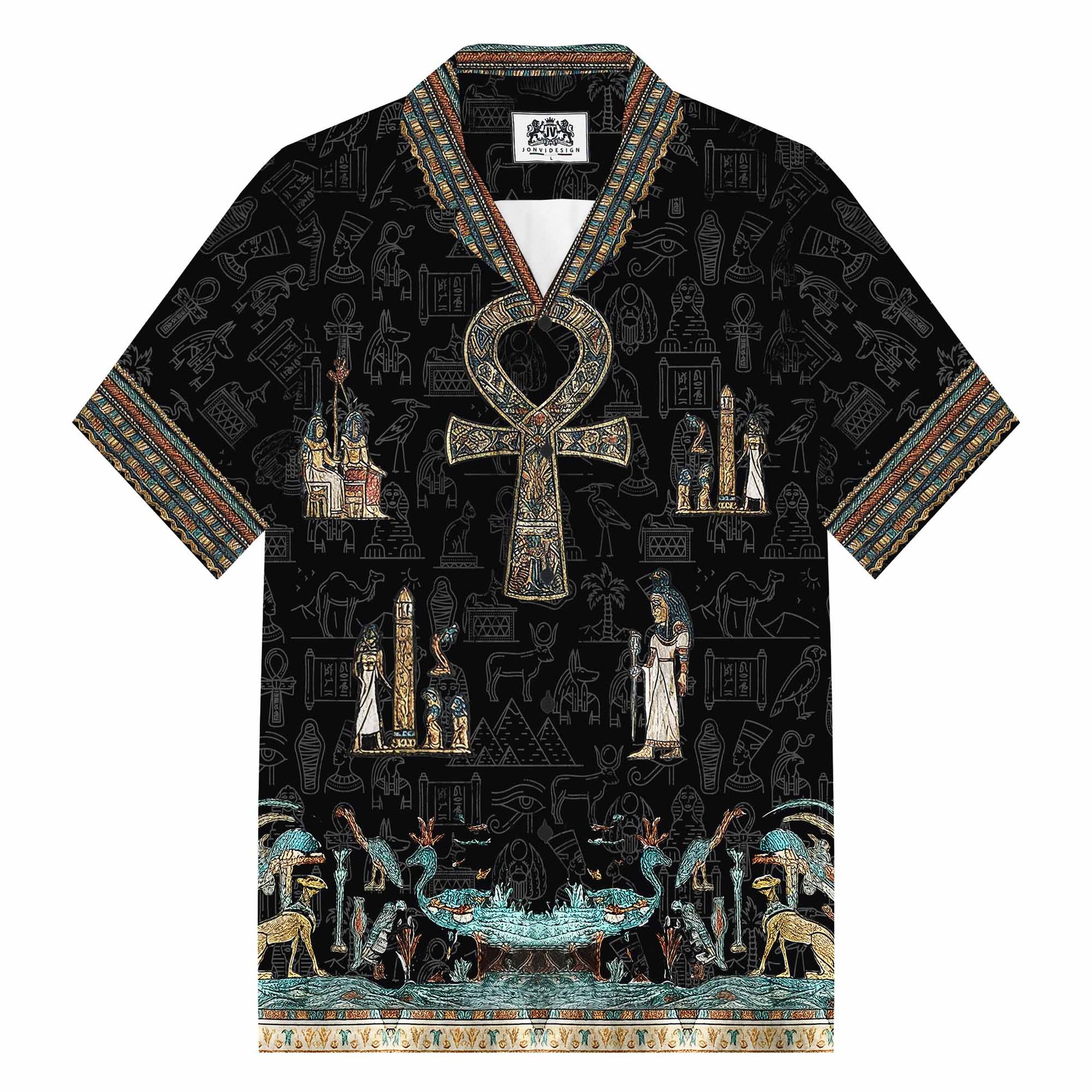 Egyptian Ankh Vintage Silk Military Collar Short-Sleeved Shirt