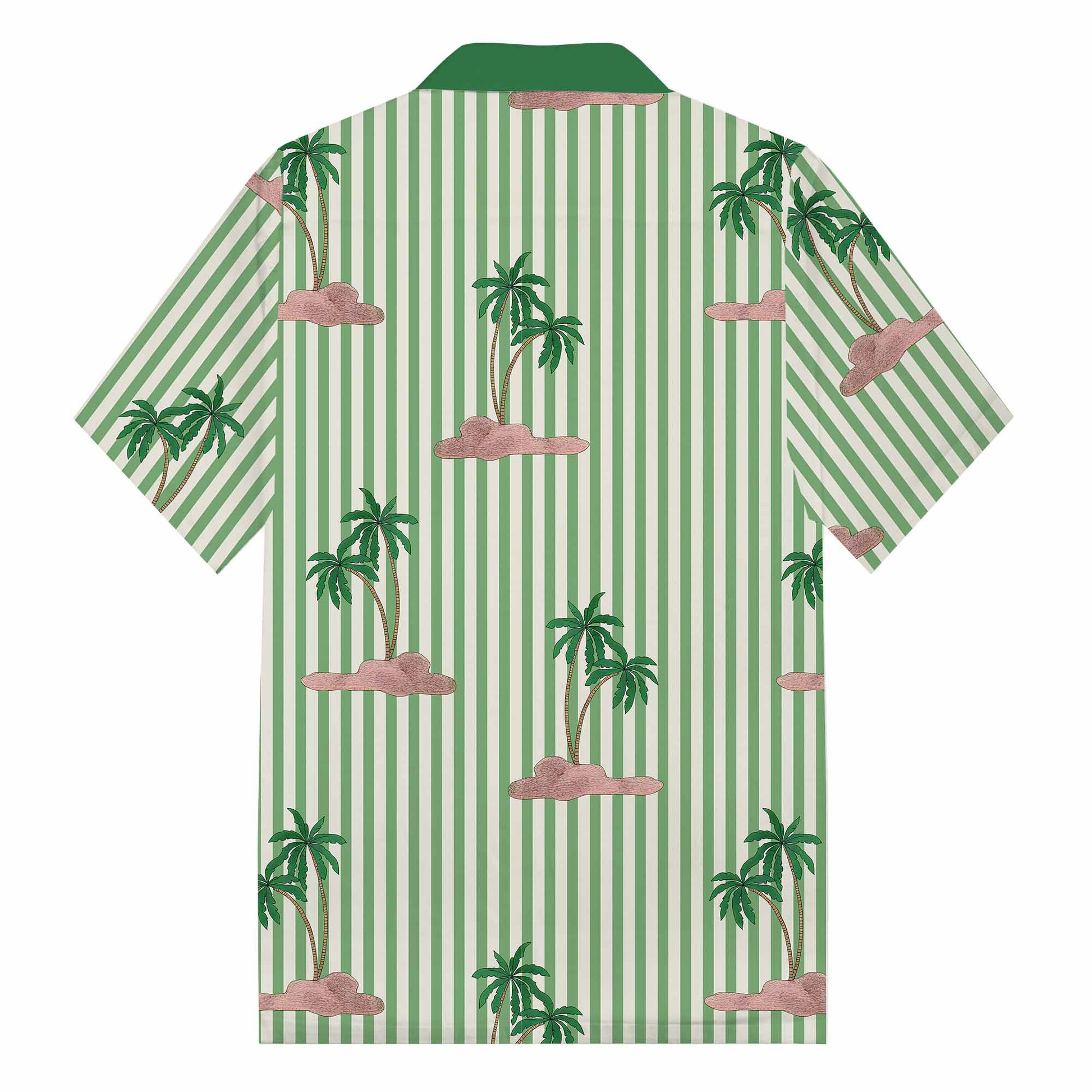 Green Striped Coconut Tree Pattern Camp Collar Short-Sleeved Shirt