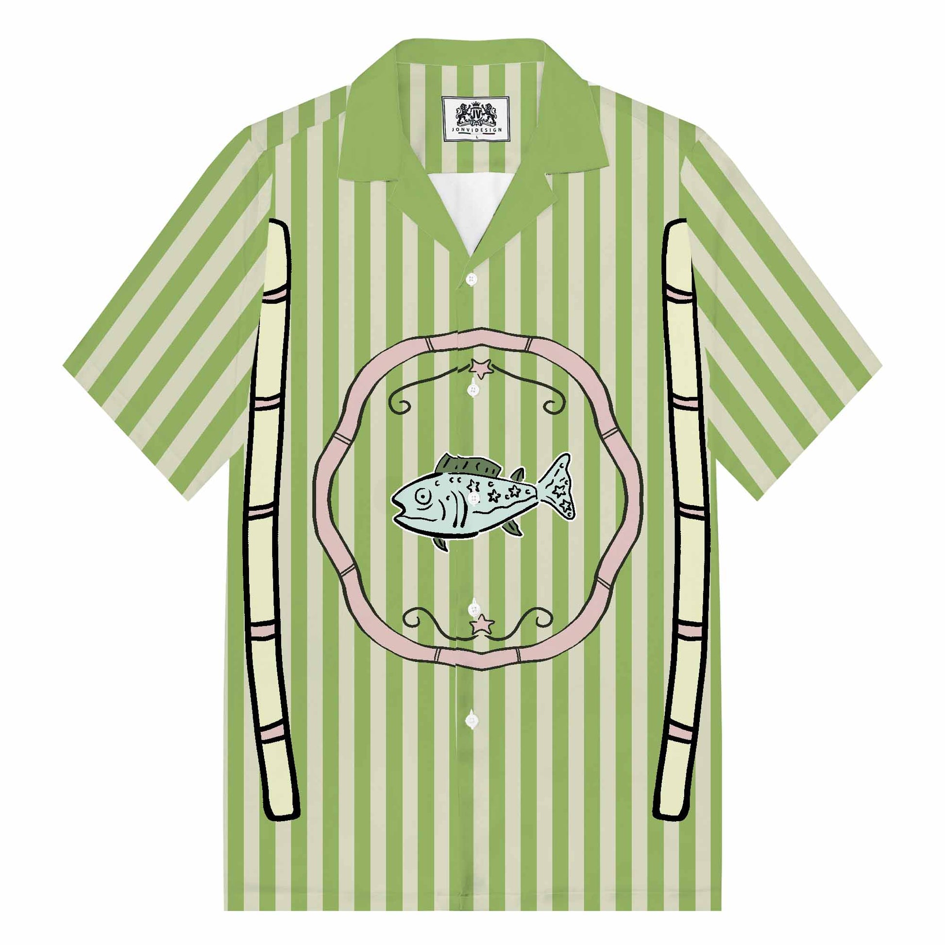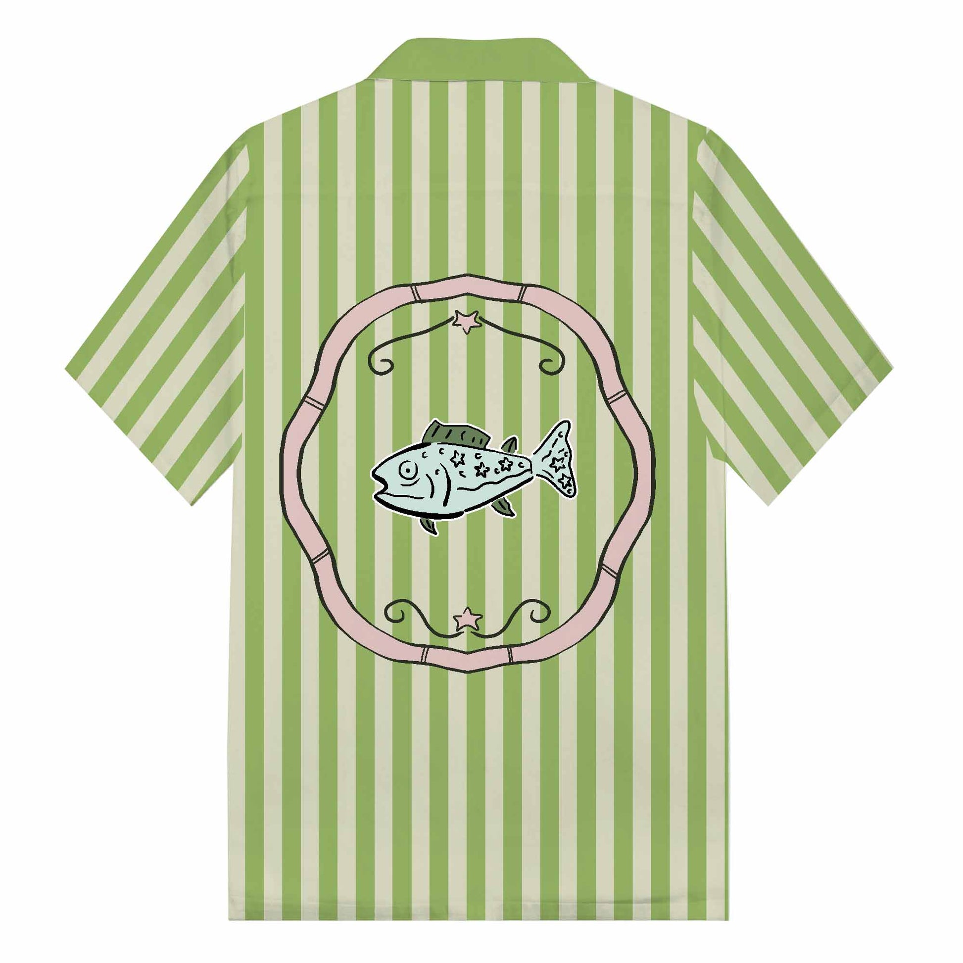 Green Vertical Stripes Fish Pattern Camp Collar Short Sleeve Shirt