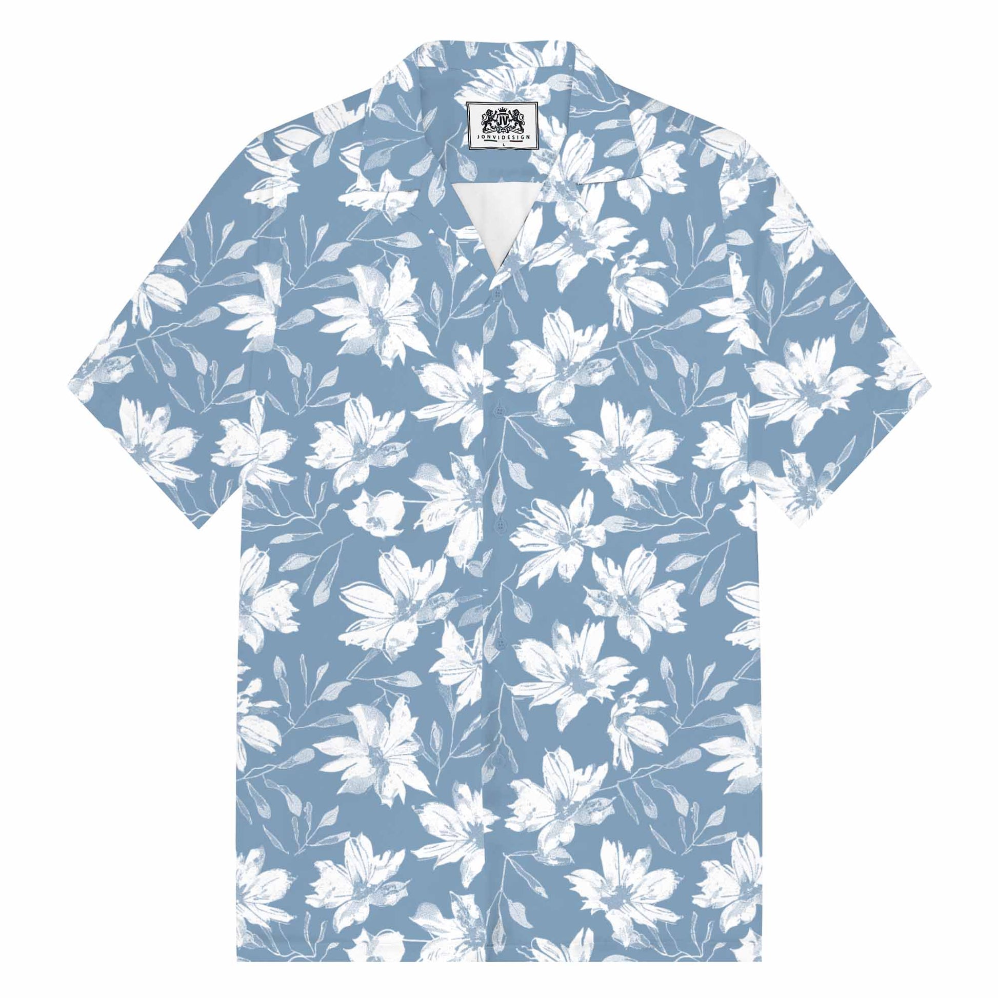 Hawaiian Shirt Blue White Floral Camp Collar Short Sleeve Shirt