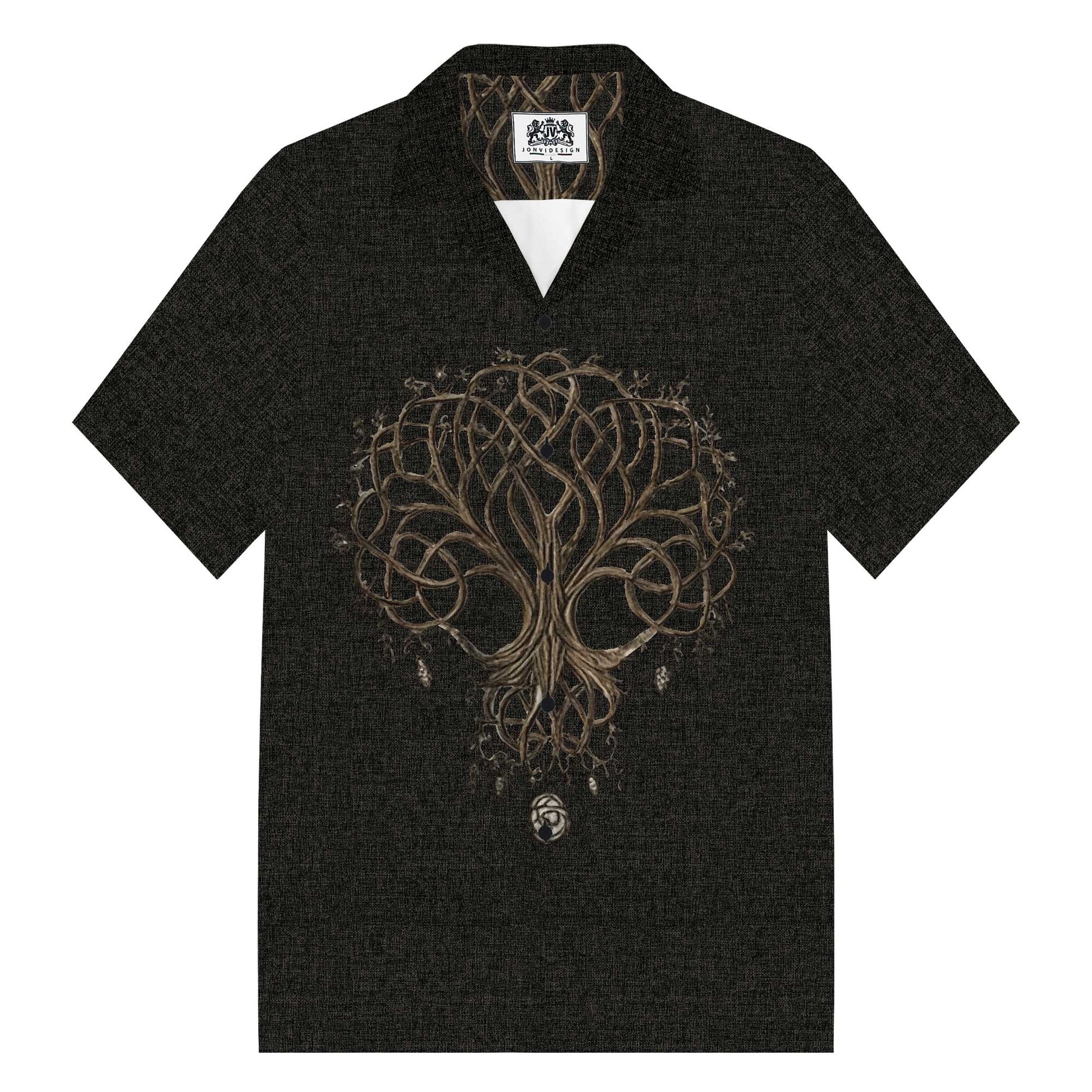Men's Black Viking Tree of Life Print Camp Collar Casual Short Sleeve Shirt