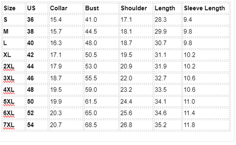 size chart -Short Sleeve Shirt(Inch)