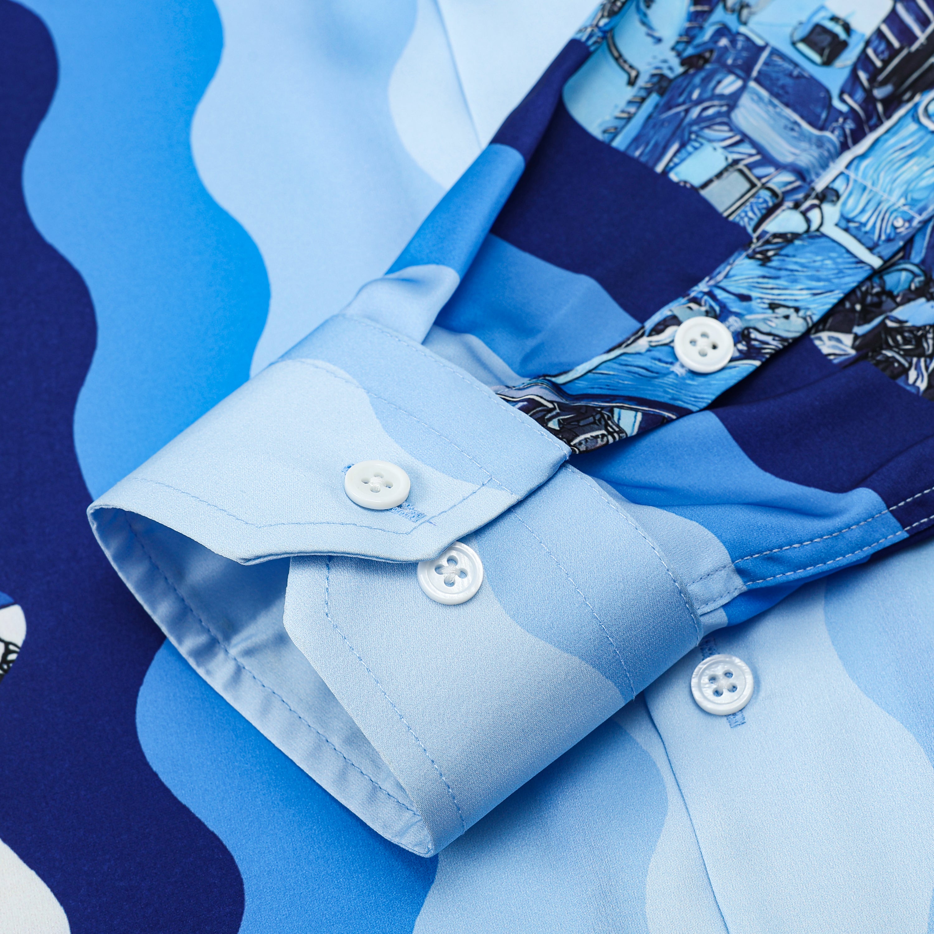 Blue Ferry Pattern Camp Collar Casual Long Sleeve Camp Collar Shirt for Men
