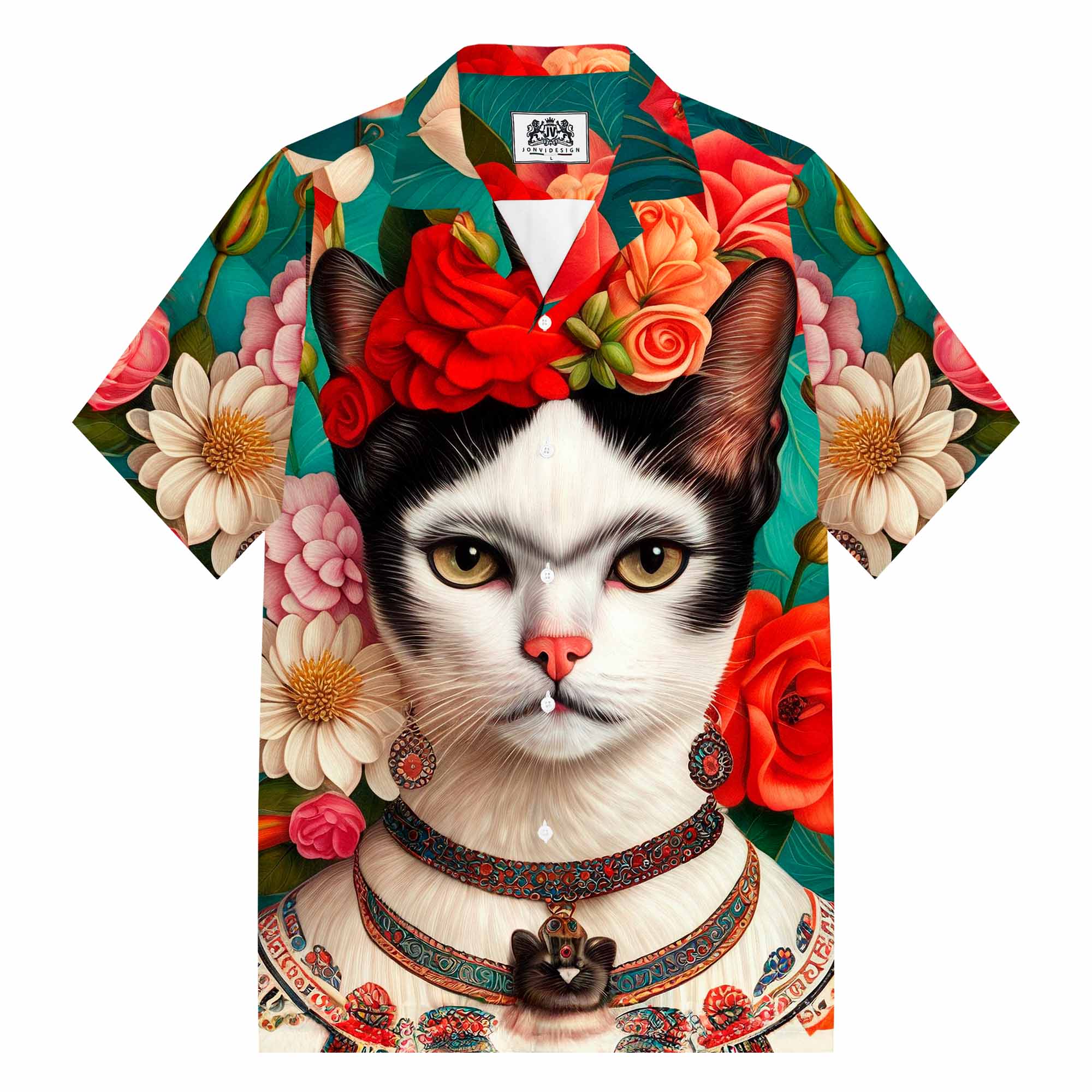 Floral Cat Print Camp Collar Short-Sleeved Shirt
