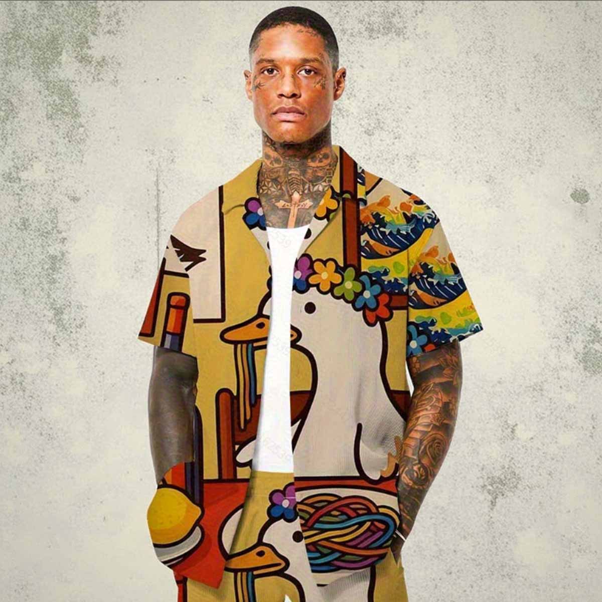 Funny Goose Eating Spaghetti Print Camp Collar Short-Sleeved Shirt