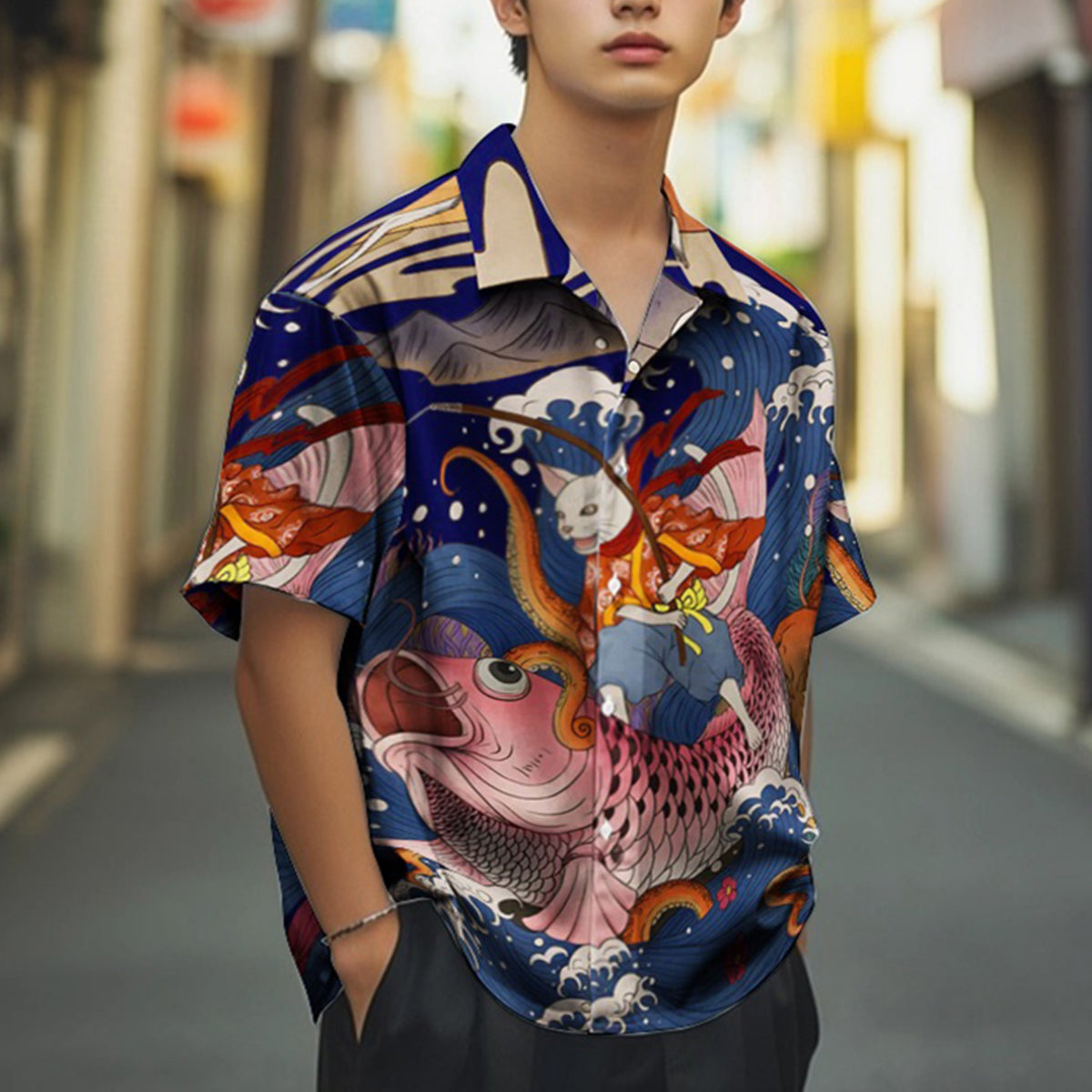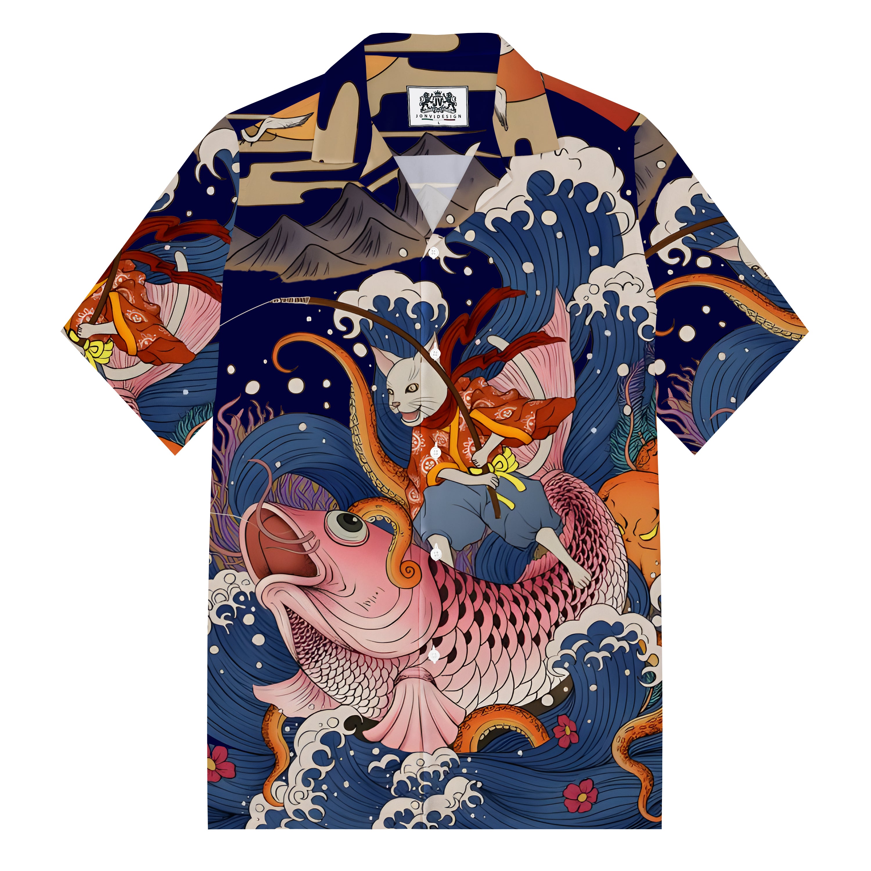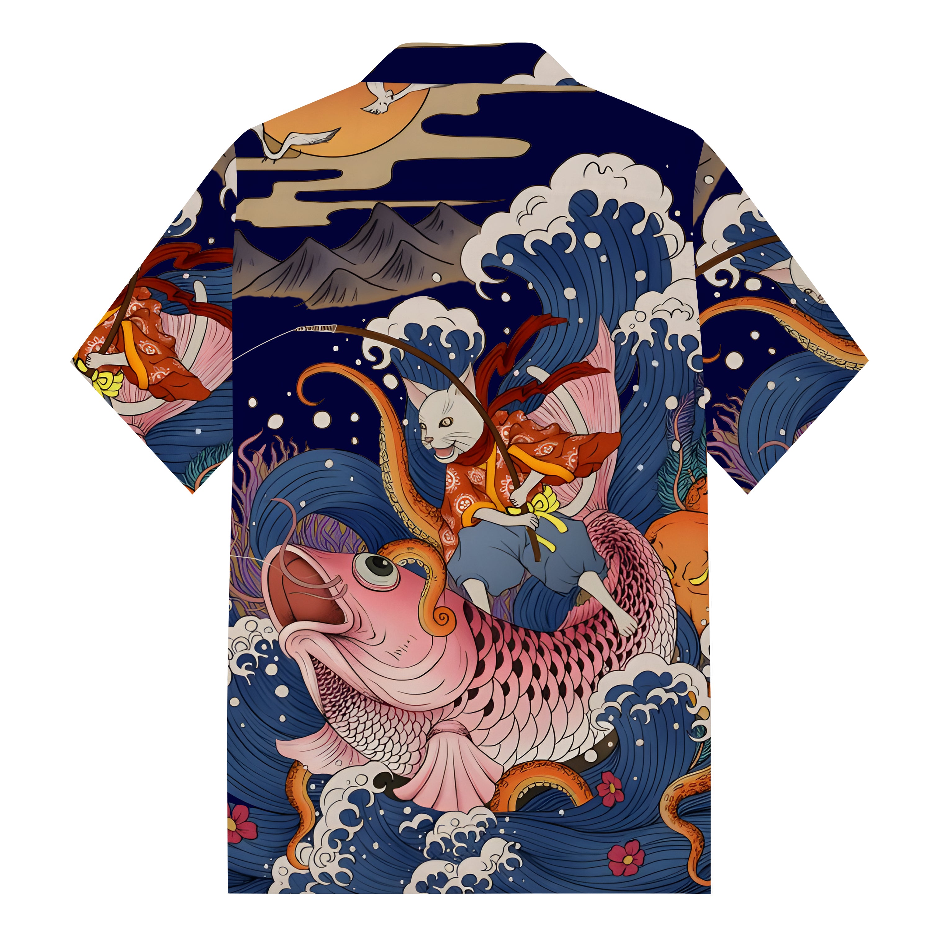 Kanagawa Sea Cat Koi Print Camp Collar Short Sleeve Shirt