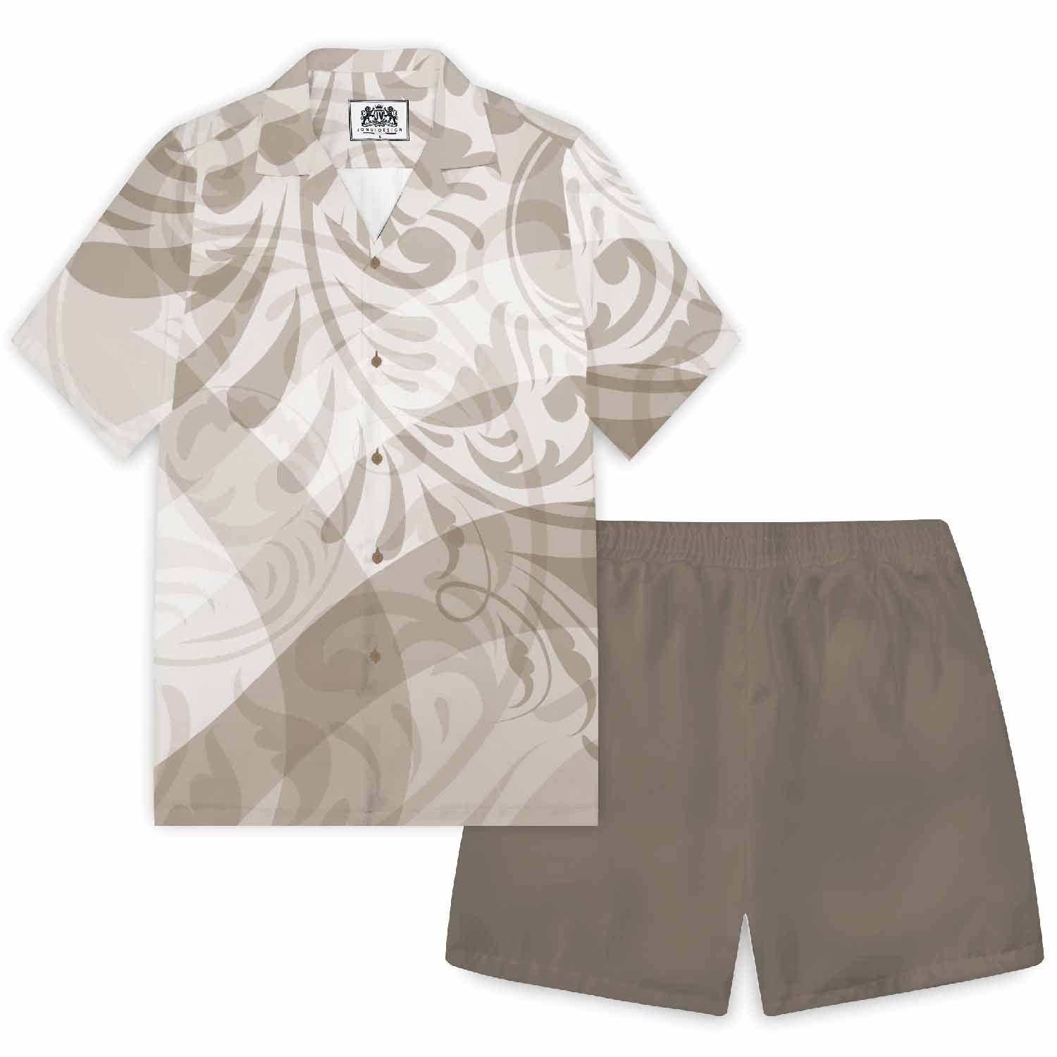 Light Brown On White Polynesian Elastic Waistband Summer Casual Shorts
