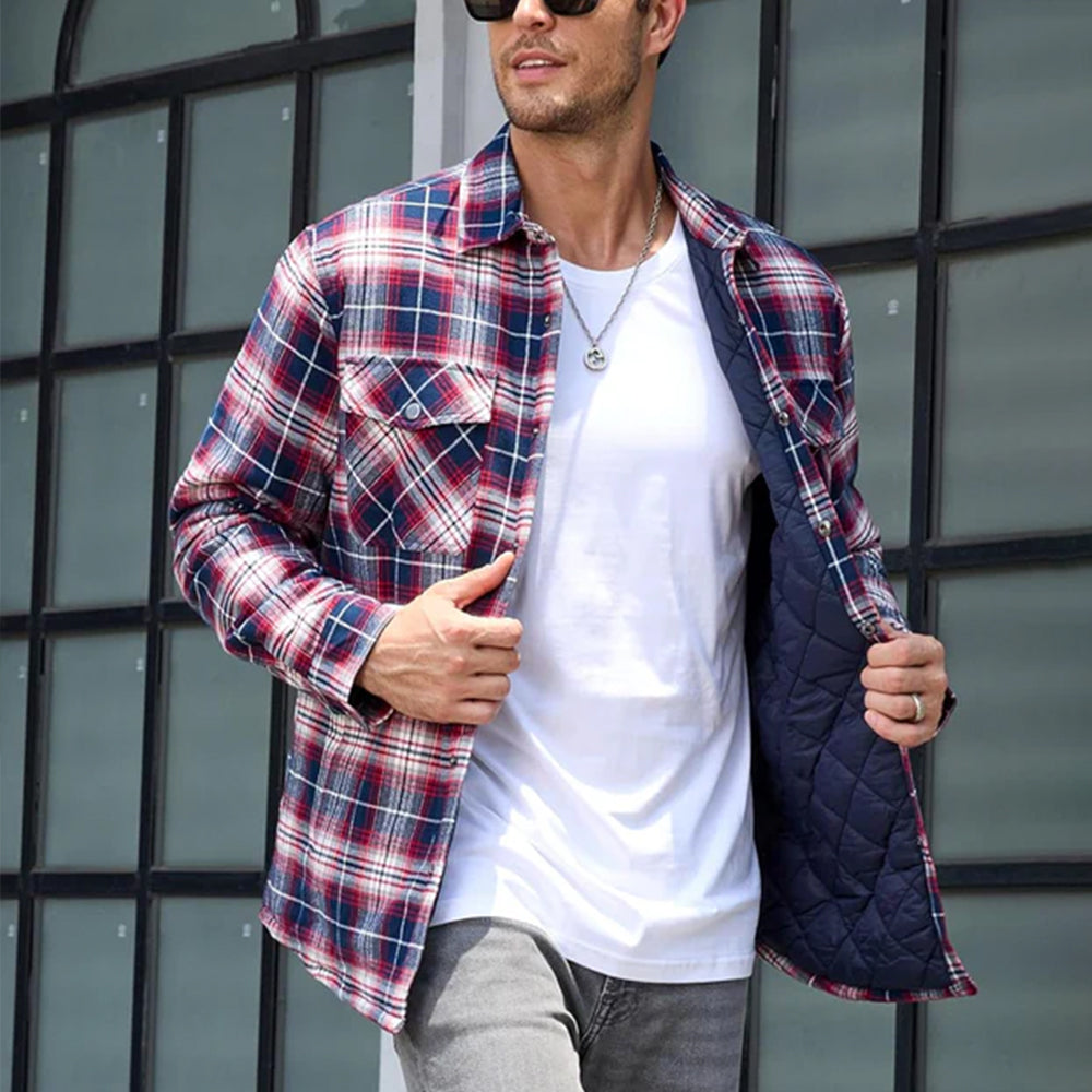 Long Sleeve Quilted Lined Plaid Flannel Shirt Jacket - Red White