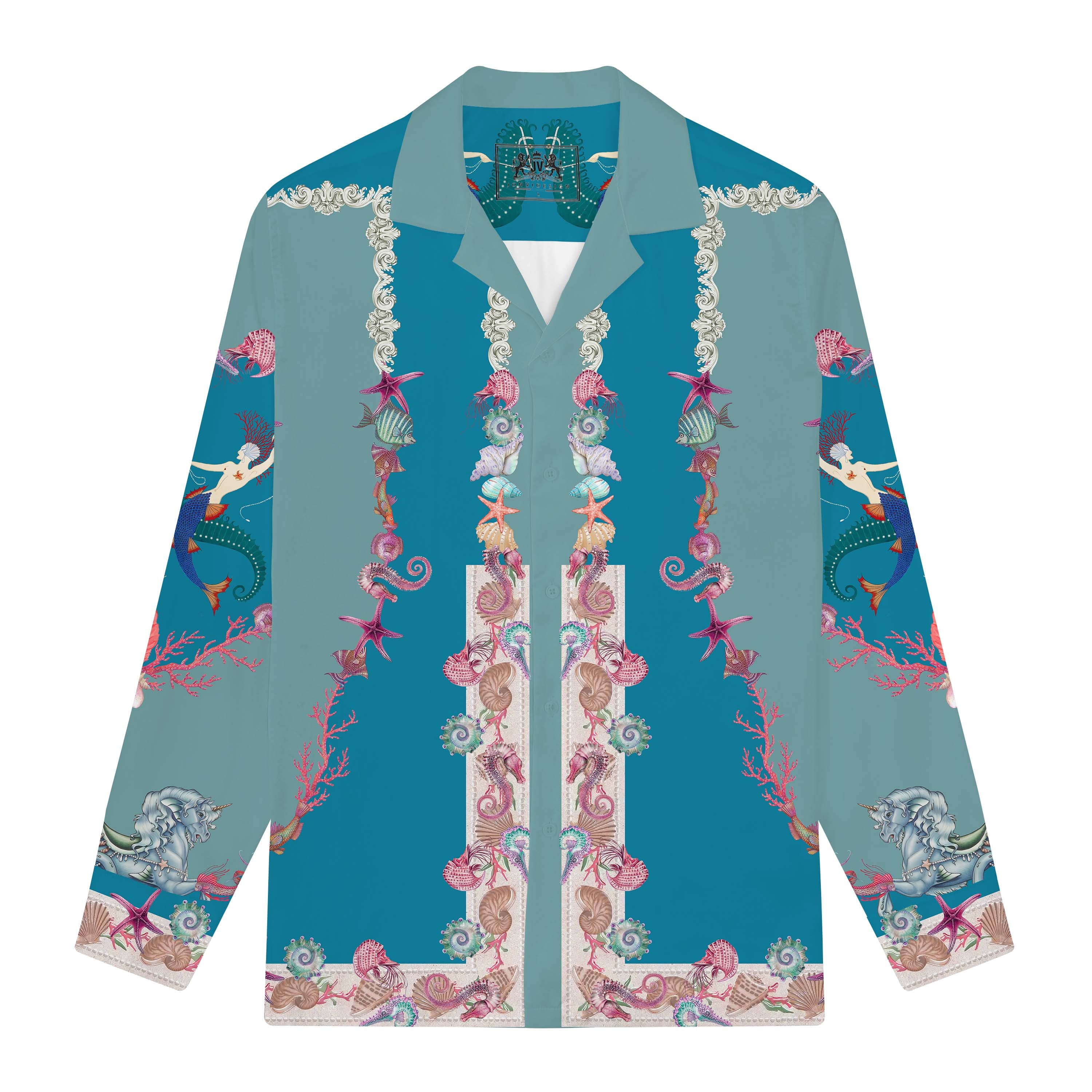 Mermaid and Ocean Print Long Sleeve Camp Collar Shirt