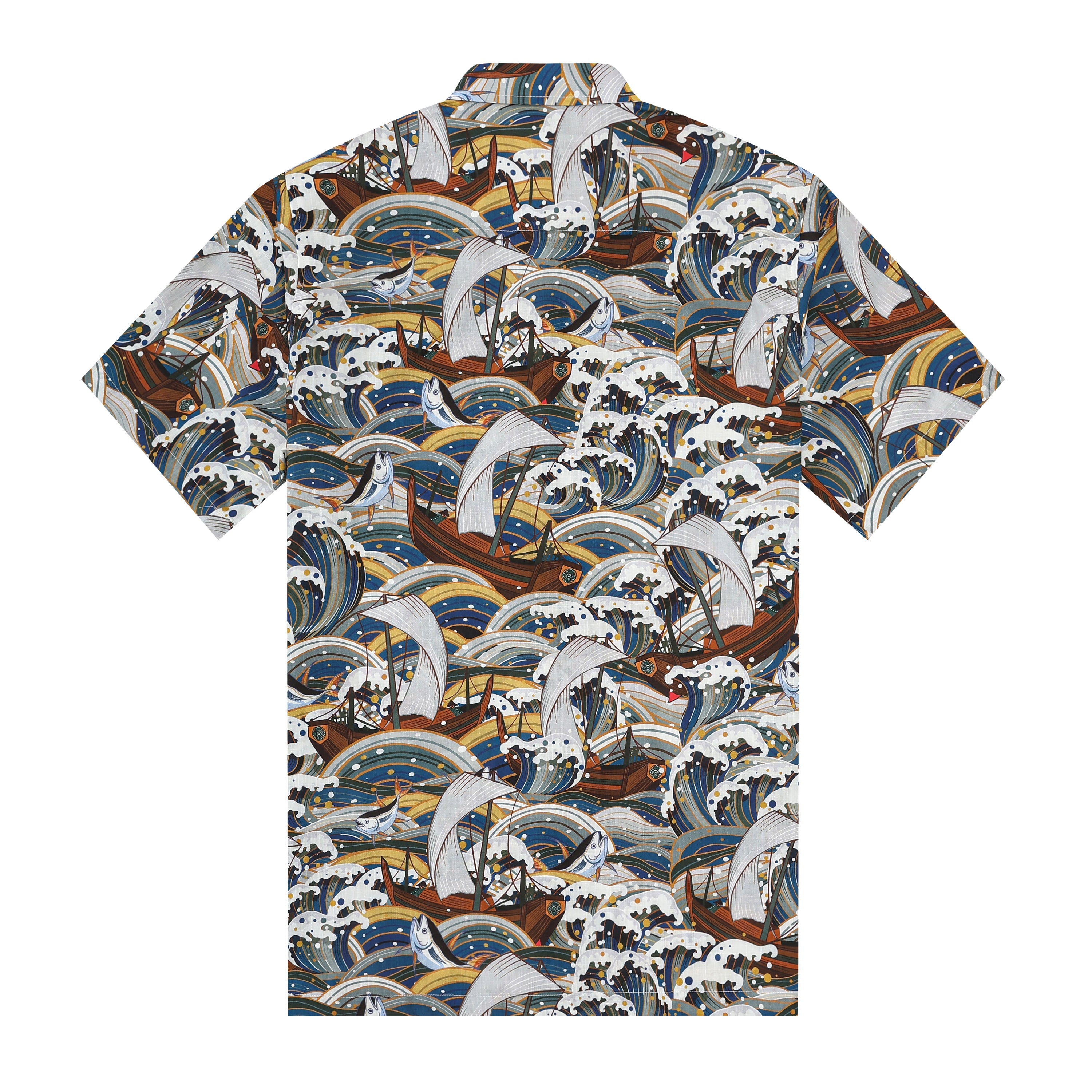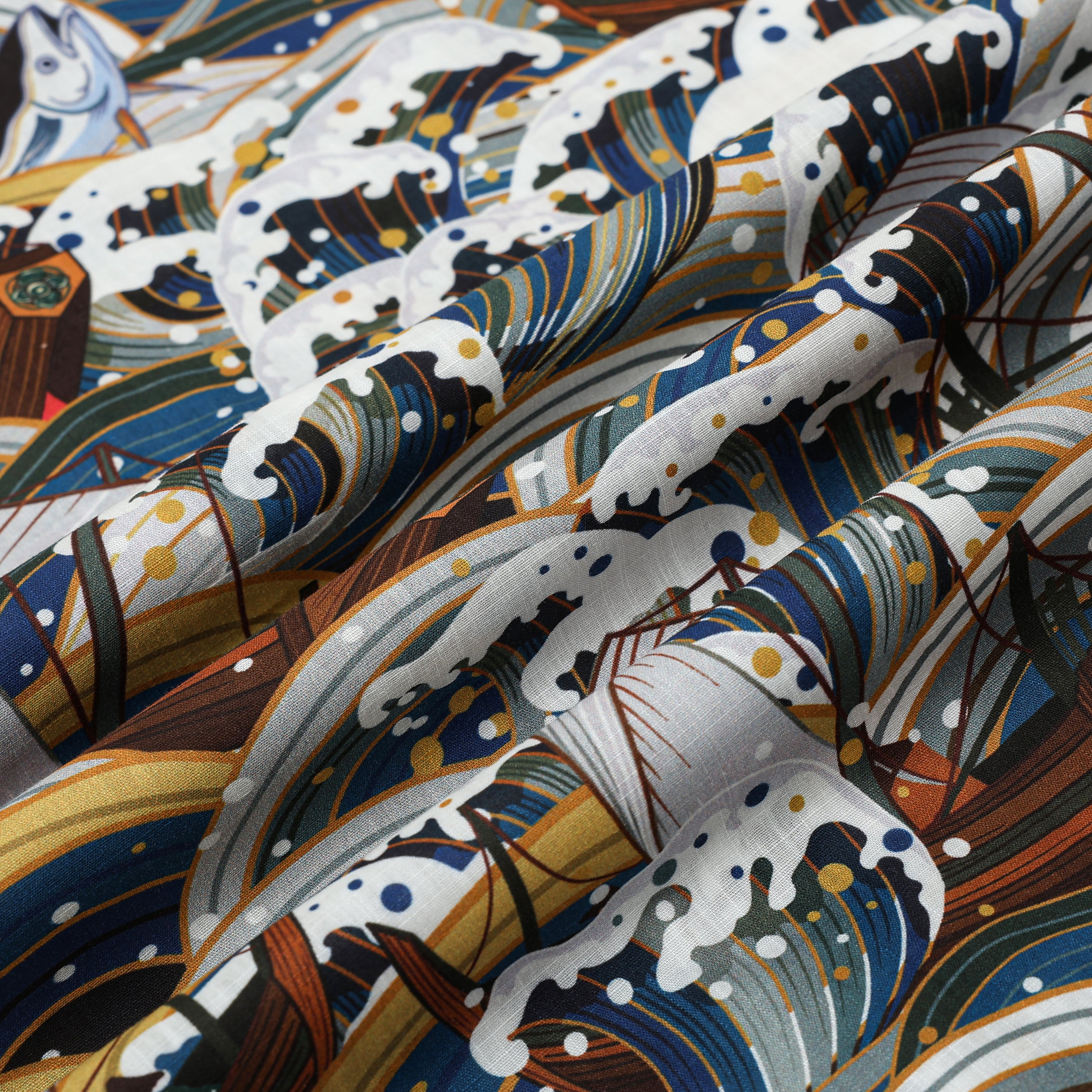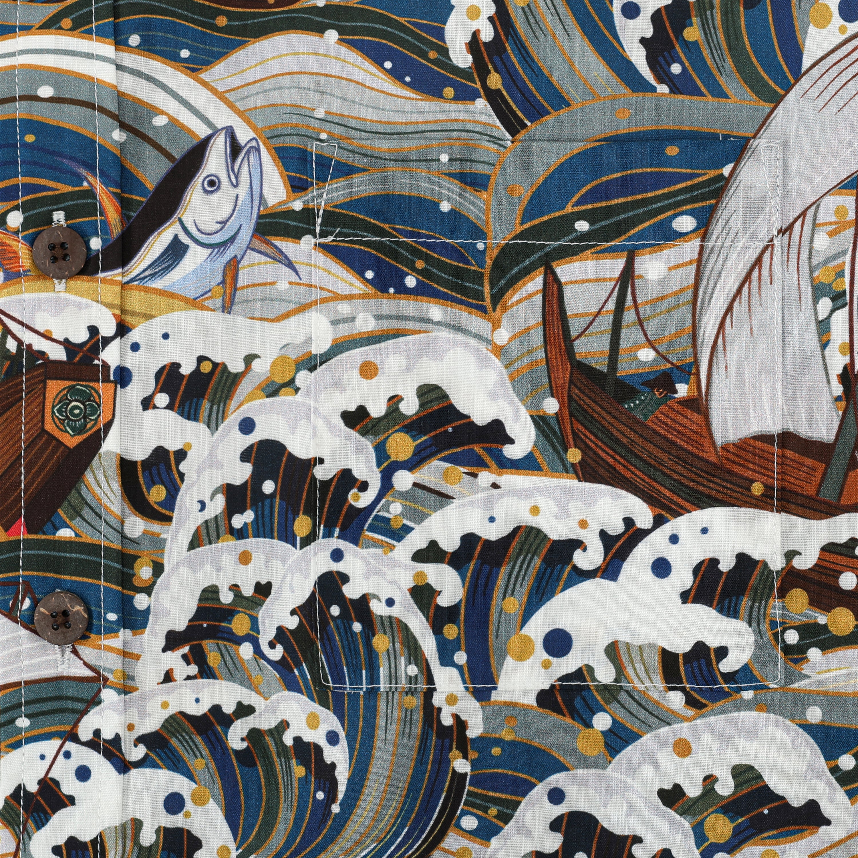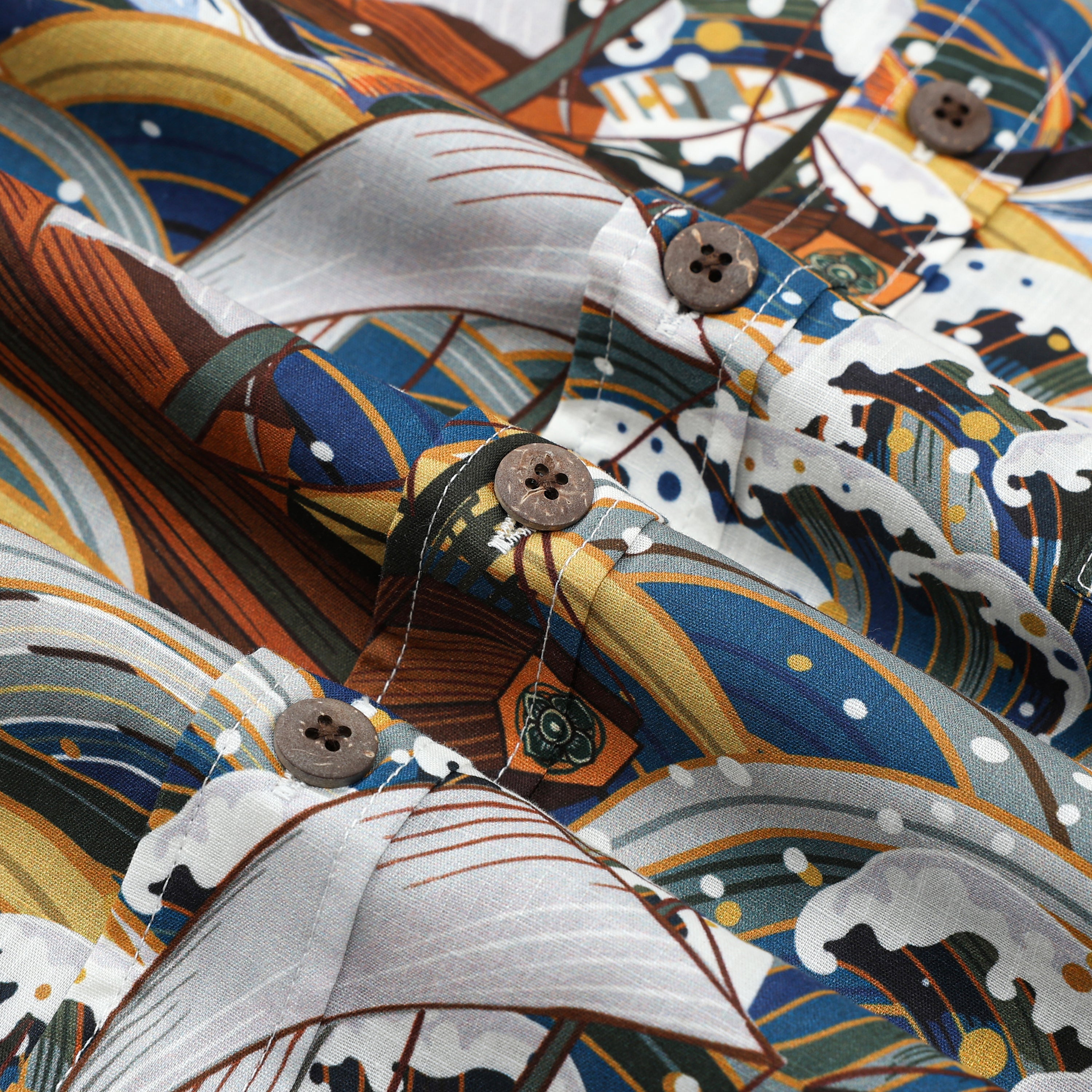 Sailboat Wave Fish Pattern Button Short Sleeve Shirt